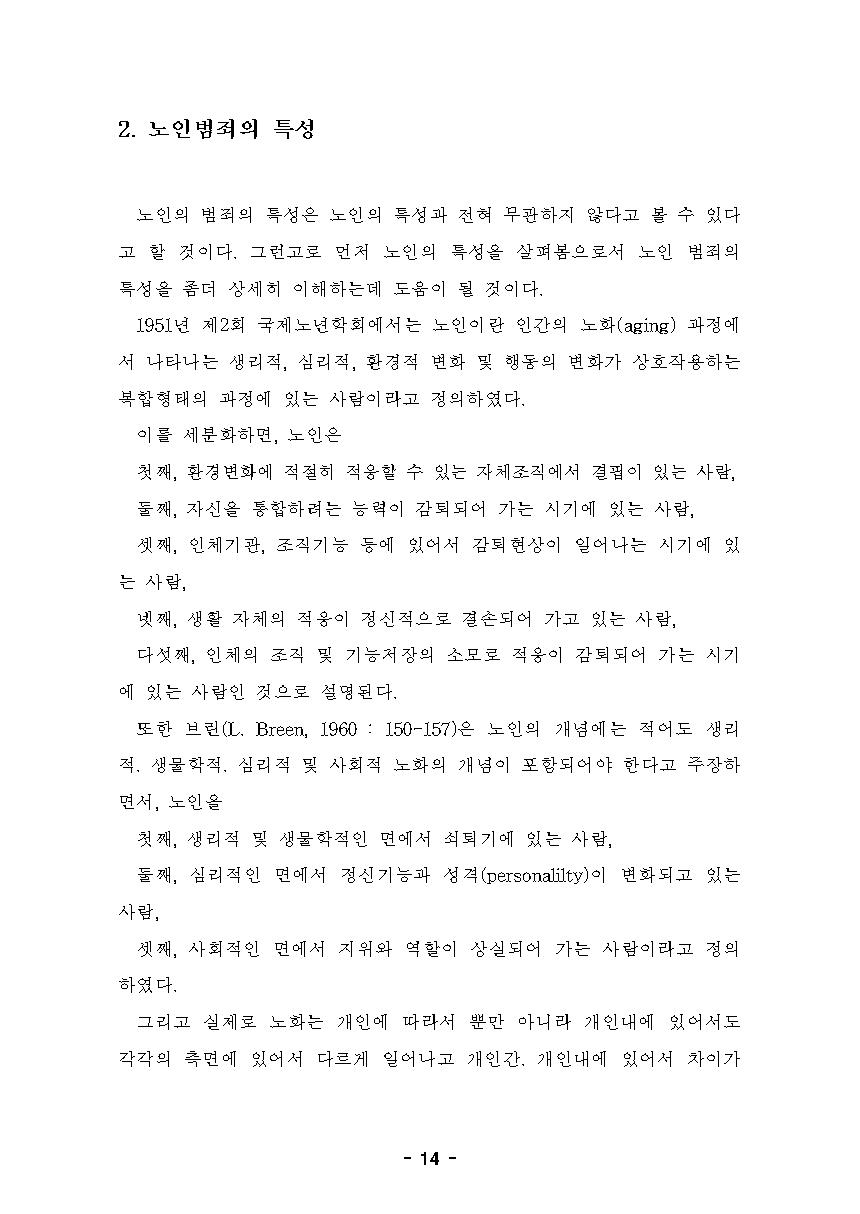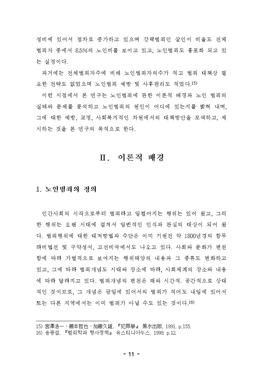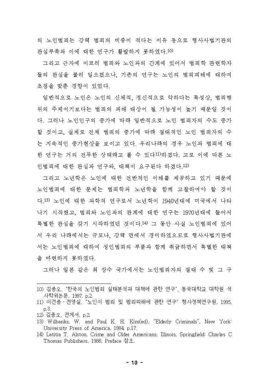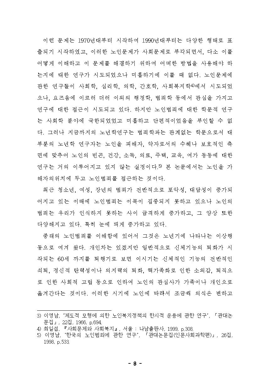 이런 문제는 1970년대부터 시작하여 1990년대부터는 다양한 형태로 표출되기 시작하였고, 이러한 노인문제가 사회문제로 부각되면서, 다소 이를 어떻게 이해하고 이 문제를 해결하기 위하여 어떠한 방법을 사용해야 하는지에 대한 연구가 시도되었으나 미흡하기에 이를 때 없다. 노인문제에 관한 연구들이 사회학, 심리학, 의학, 간호학, 사회복지학에서 시도되었으나, 요즈음에 이르러 더러 이외의 행정학, 범죄학 등에서 관심을 가지고 연구에 대한 접근이 시도되고 있다. 하지만 노인범죄에 대한 학문적 연구는 사회학 분야에 국한되었었고 미흡하고 단편적이었음을 부인할 수 없다. 그러나 지금까지의 노년학연구는 범죄학과는 관계없는 학문으로서 대부분의 노년학 연구자는 노인을 피해자, 약자로서의 수혜나 보호적인 측면에 맞추어 노인의 빈곤, 건강, 소득, 의료, 주택, 교육, 여가 등등에 대한 연구는 거의 이루어지고 있지 않는 실정이다. 본 논문에서는 노인을 가해자의위치에 두고 노인범죄를 접근하는 것이다.