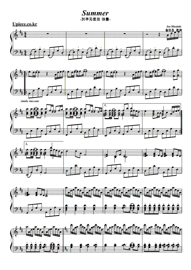 기쿠지로의 여름 OST, 썸머, Summer, 히사이시조, 피아노악보, 무료악보, pdf악보, 치기쉬운피아노악보입니다.